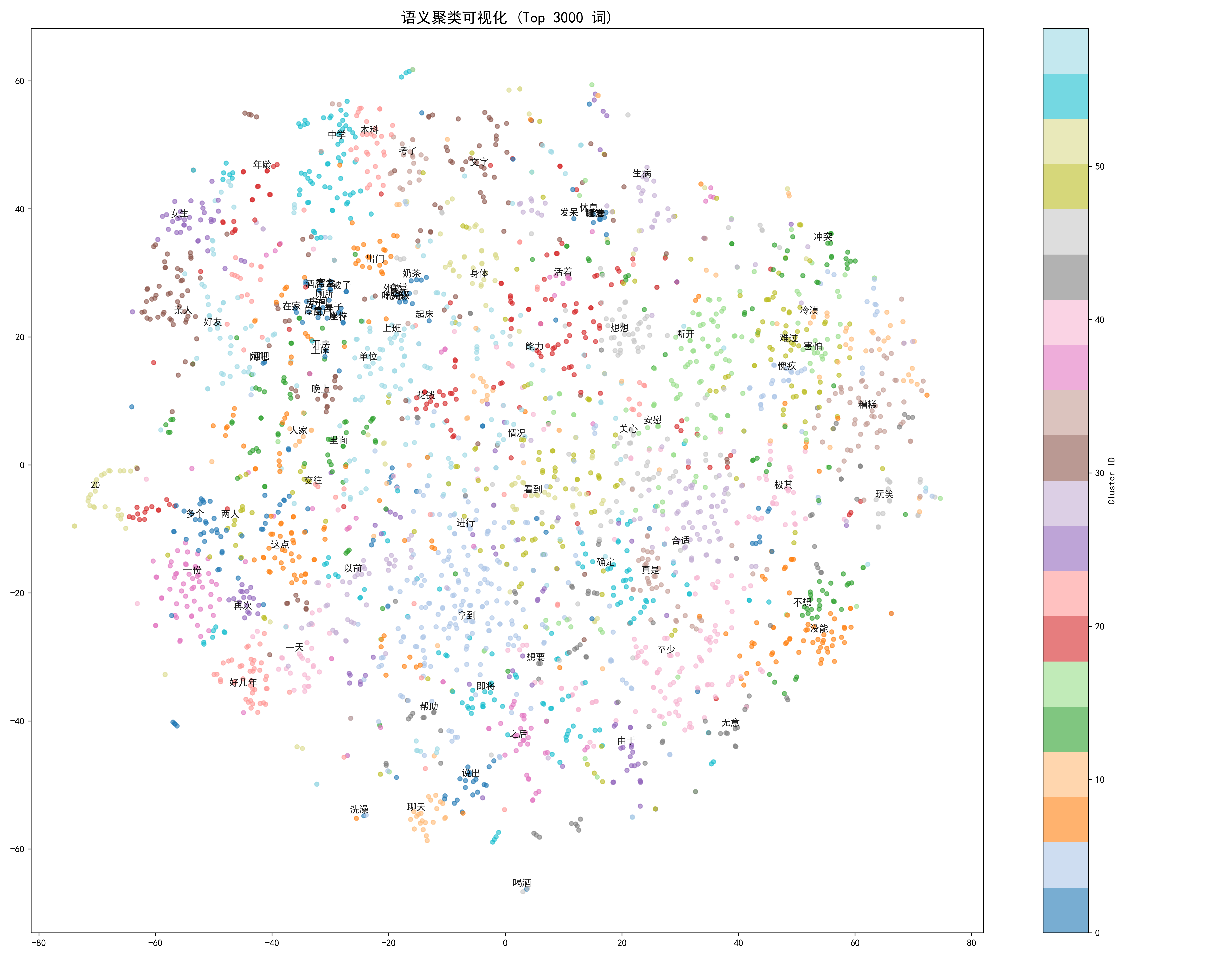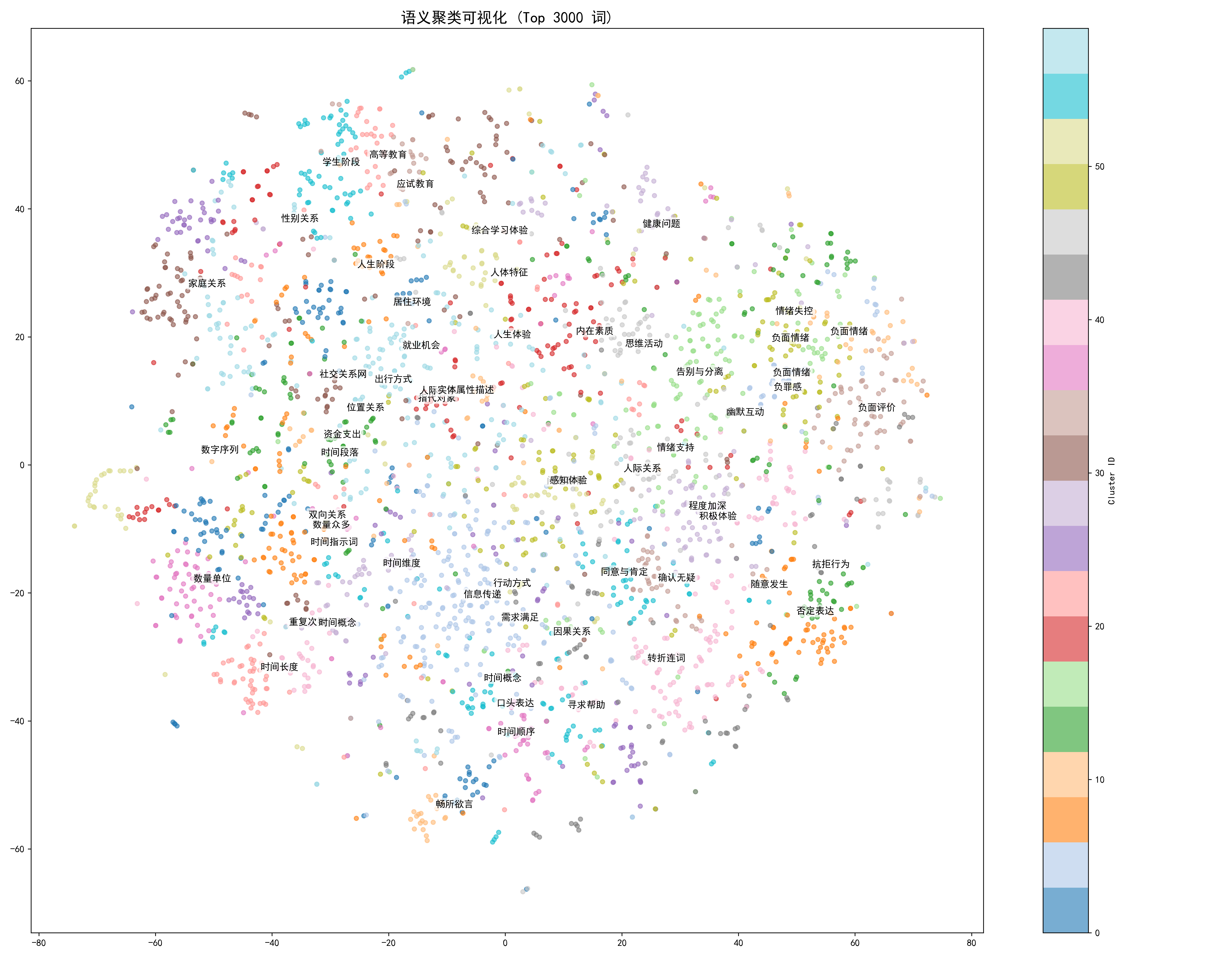 计算绝对频次,随后进行数据标准化处理,导出生成了标准化热度表以及绝对频次表。使用 BAAI/bge-large-zh-v1.5 模型将排名前 3000 的高频词转换为高维向量,随后采用 K-Means 算法将关键词聚类为 60 个语义簇,并选取距离中心最近的词作为该话题的代表命名或者使用 Google/Gemma3-12B 模型寻找代表词。利用t-SNE算法生成语义地图,将高维词向量降维至二维平面并绘制散点图。