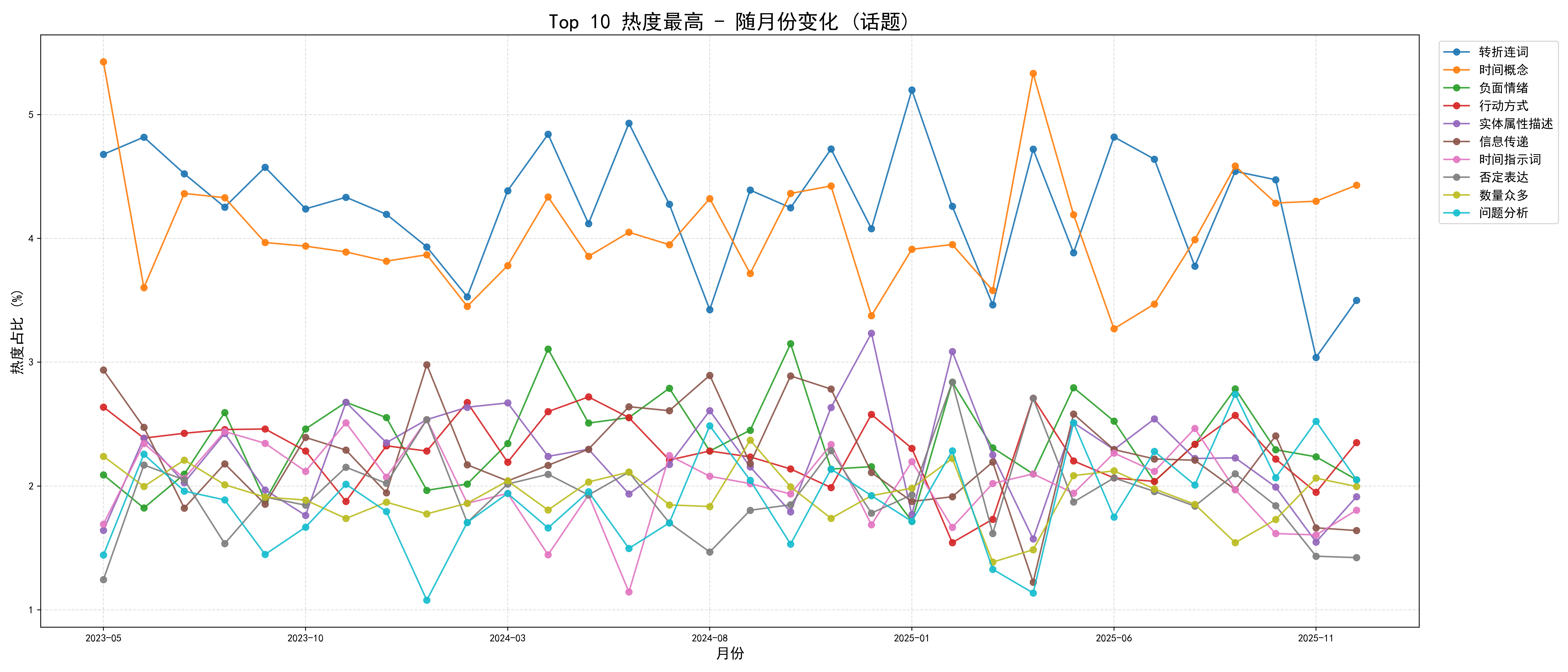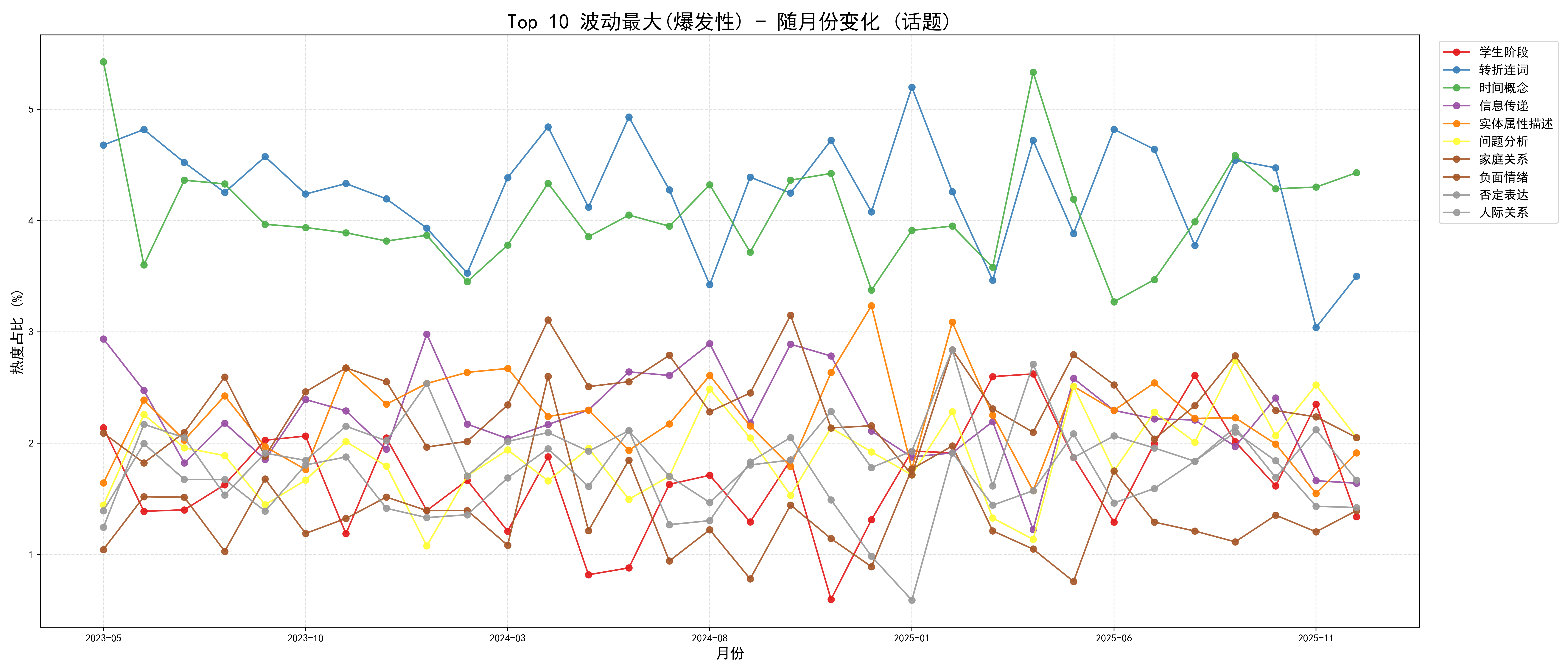 制作了趋势分析图,包括展示持续热度最高的话题的总量Top 10图表,以及基于标准差筛选的波动Top 10图表,用于展示爆发性最强或波动最大的话题。
